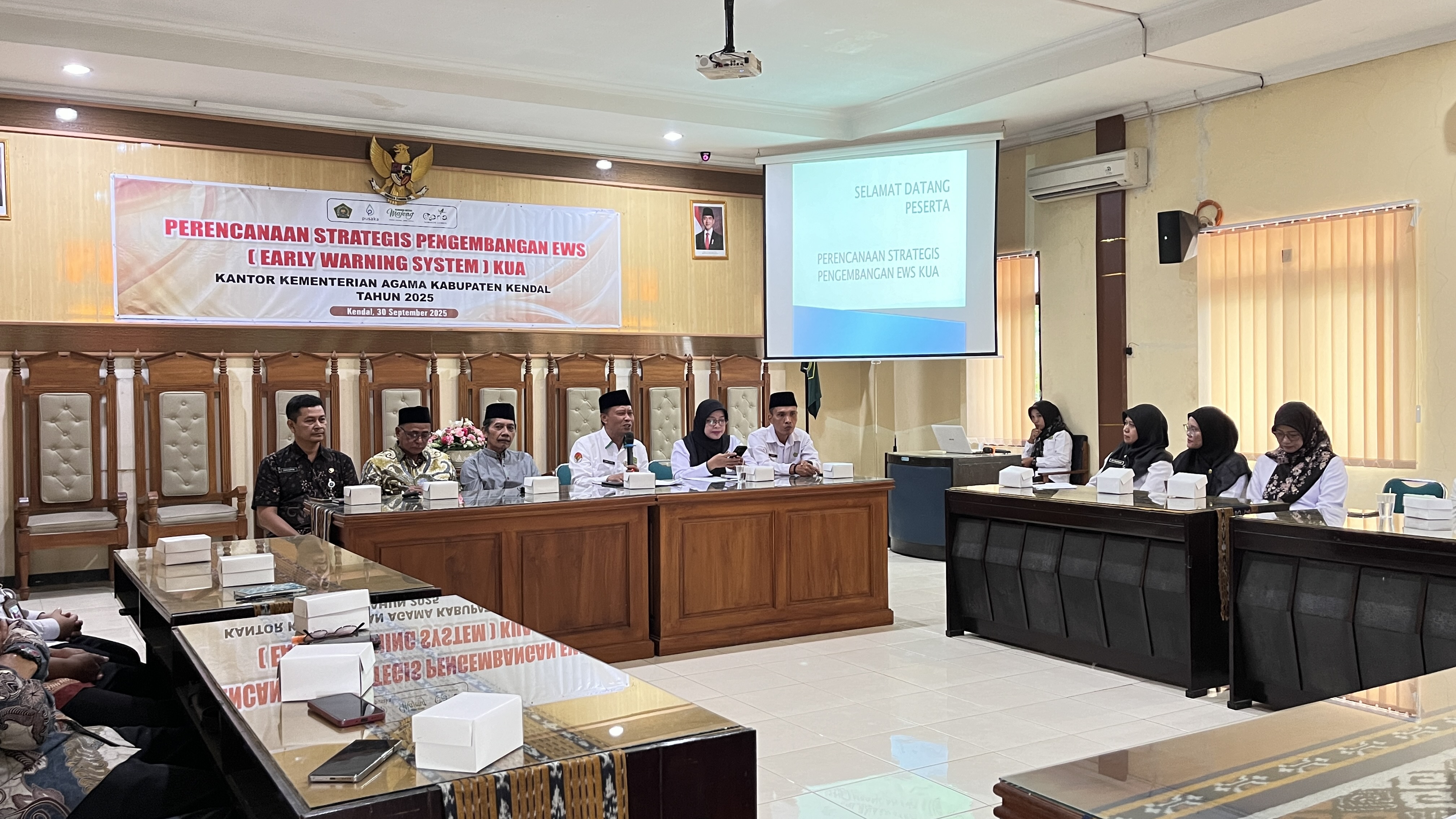Kendal (Humas) –  Kantor Kementerian Agama Kabupaten Kendal menggelar kegiatan Perencanaan Strategis Pengembangan Early Warning System (EWS) KUA, Selasa (30/9/2025). Acara yang berlangsung di Aula Lantai 2 Kankemenag Kendal ini dihadiri berbagai kalangan, mulai dari perwakilan Badan Kesbangpol Kendal, MUI, FKUB, para Kepala KUA, penyuluh agama Islam, Kristen, dan Katolik, hingga perwakilan ormas keagamaan di wilayah Kabupaten Kendal.